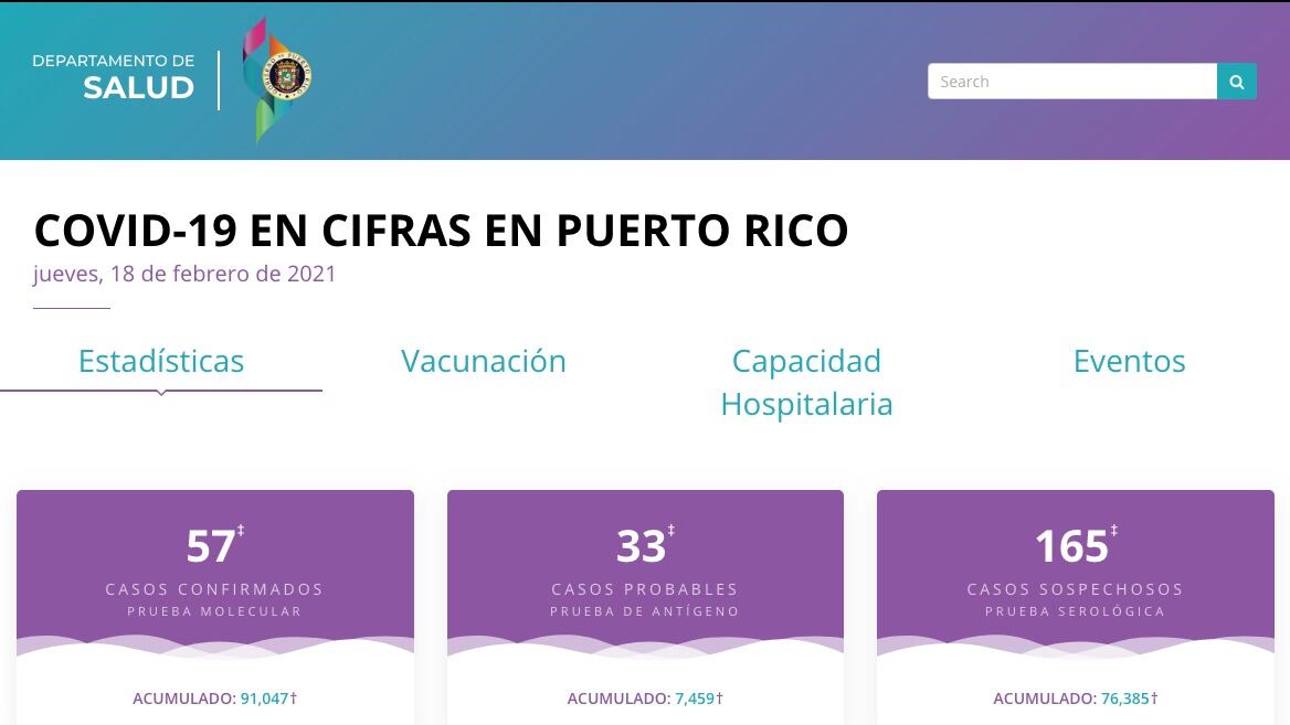 La plataforma está dividida en segmentos como estadísticas de casos en la isla, proceso de vacunación, capacidad hospitalaria y eventos.