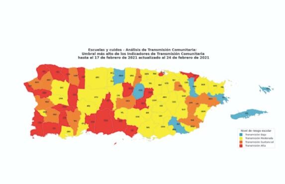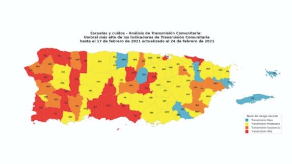Más temprano, el Secretario del Departamento de Salud, Carlos Mellado, incidó que, a nivel isla, Puerto Rico se encuentra en nivel naranja, el tercero de los cuatro niveles de riesgo. En tanto, la mayoría de los municipios, al momento, aparecen en amarillo, el segundo nivel de riesgo más alto.
