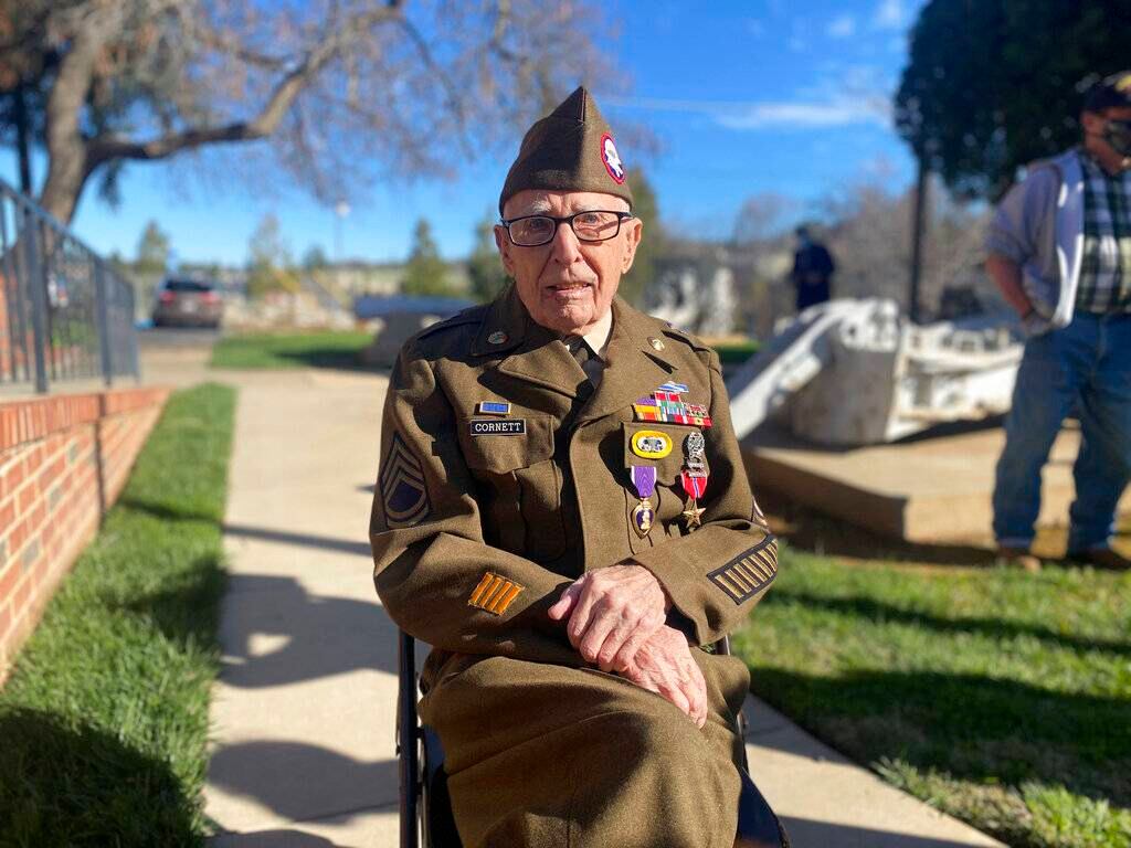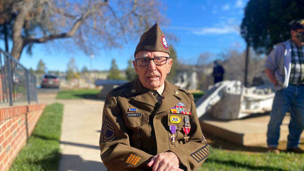 Casi 80 años después de resultar herido por un mortero alemán mientras peleaba en el Canal Mussolini en Italia, el sargento de primera del ejército estadounidense Marvin Cornett posó orgulloso en su impecable uniforme adornado esta vez con el Corazón Púrpura y la Estrella de Bronce.