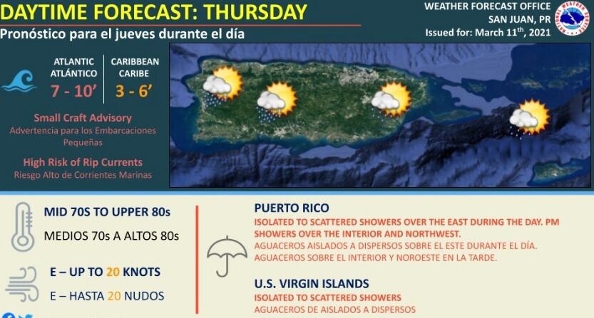 Para este jueves en la mañana se esperan aguaceros de aislados a dispersos sobre el este de Puerto Rico, mientras que en la tarde se anticipa lluvia sobre el interior y noroeste de la Isla, informó la oficina en San Juan del Servicio Nacional de Meteorología (SNM).