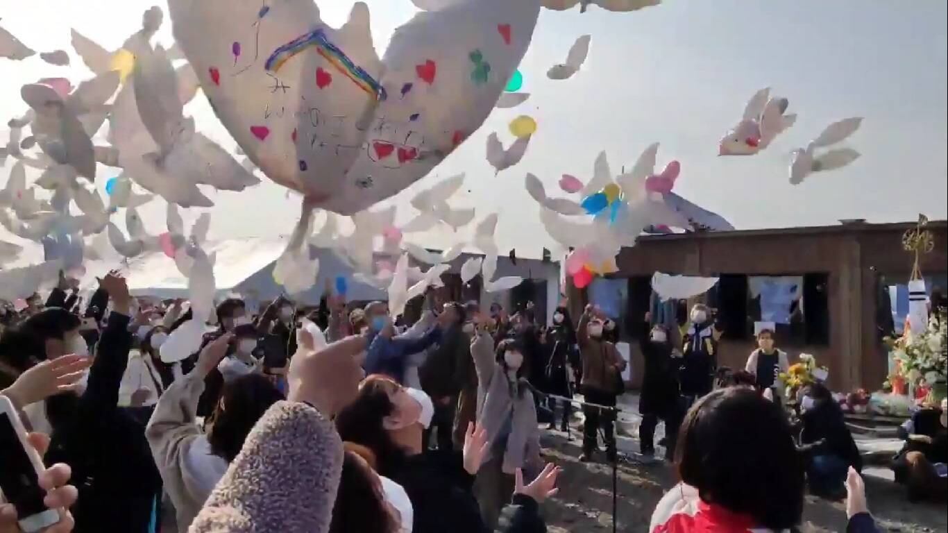 Los habitantes de Natori conmemoraron este jueves 11 de marzo el décimo aniversario del terremoto y el tsunami que devastaron la costa oriental de Japón, soltando globos en forma de paloma hacia el cielo.
