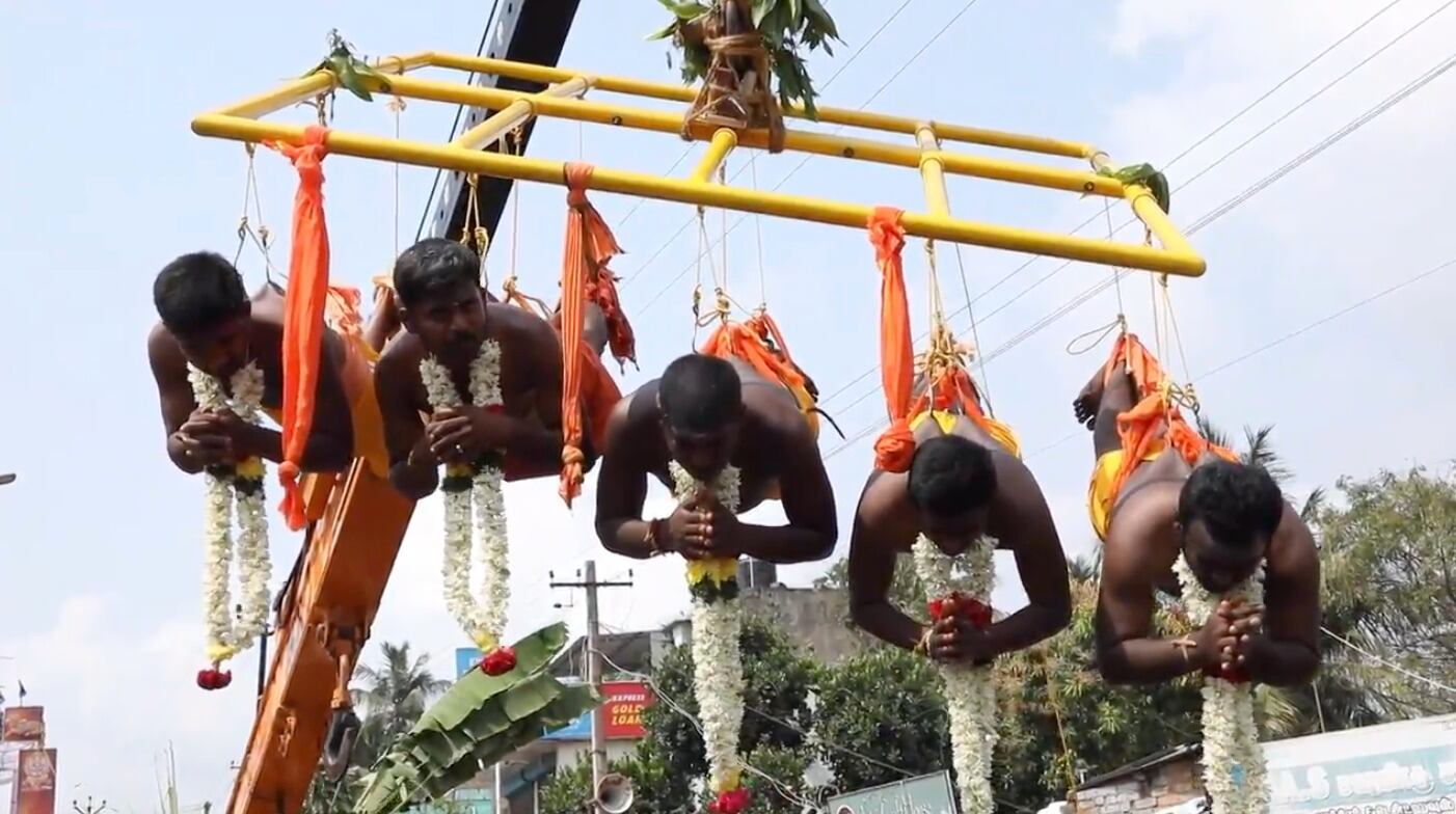 Durante las celebraciones, varios hombres creyentes perforaron sus espaldas con ganchos, y mientras algunos quedaron suspendidos en el aire colgando de grúas, otros tiraron de un carro que transportaba una figura del dios hindú Murugan.