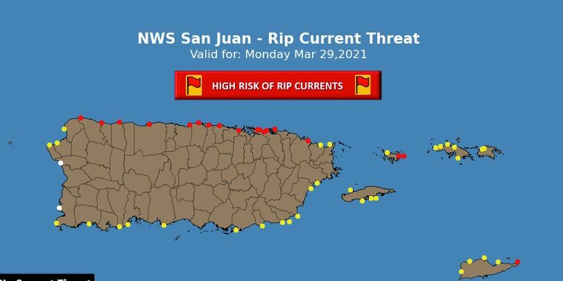 Hay riesgo de corrientes marinas de moderado a alto para la mayoría de las playas de la isla grande de Puerto Rico, Vieques y Culebra.