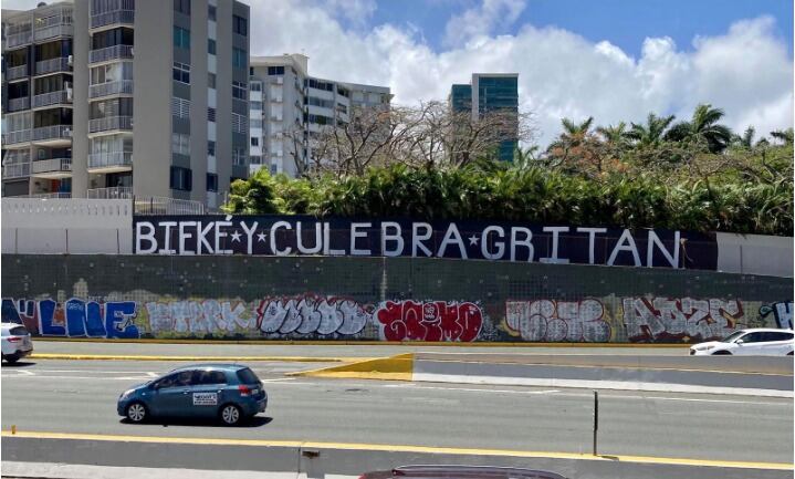 Un mural con fondo negro y letras blancas fue alzado hoy en un puente de la avenida Baldorioty de Castro a la altura de Santurce, en apoyo a la lucha de Vieques y Culebras por un mejor servicio de lanchas.