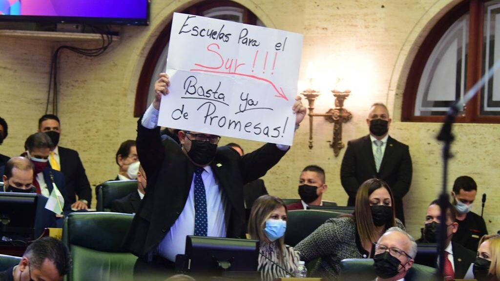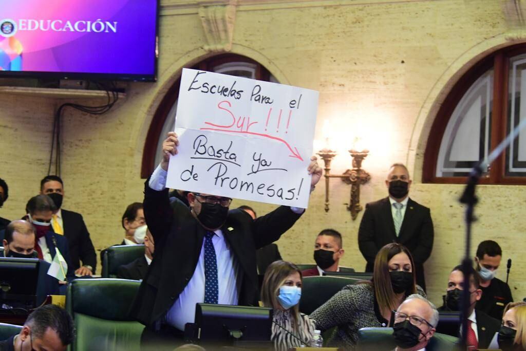 Rivera Madera, quien es representante por el distrito 23 que agrupa los municipios de Yauco, Guayanilla, Peñuelas y el suroeste de Ponce, exhibió un cartel que leía “Escuelas para el Sur, Basta de promesas”.