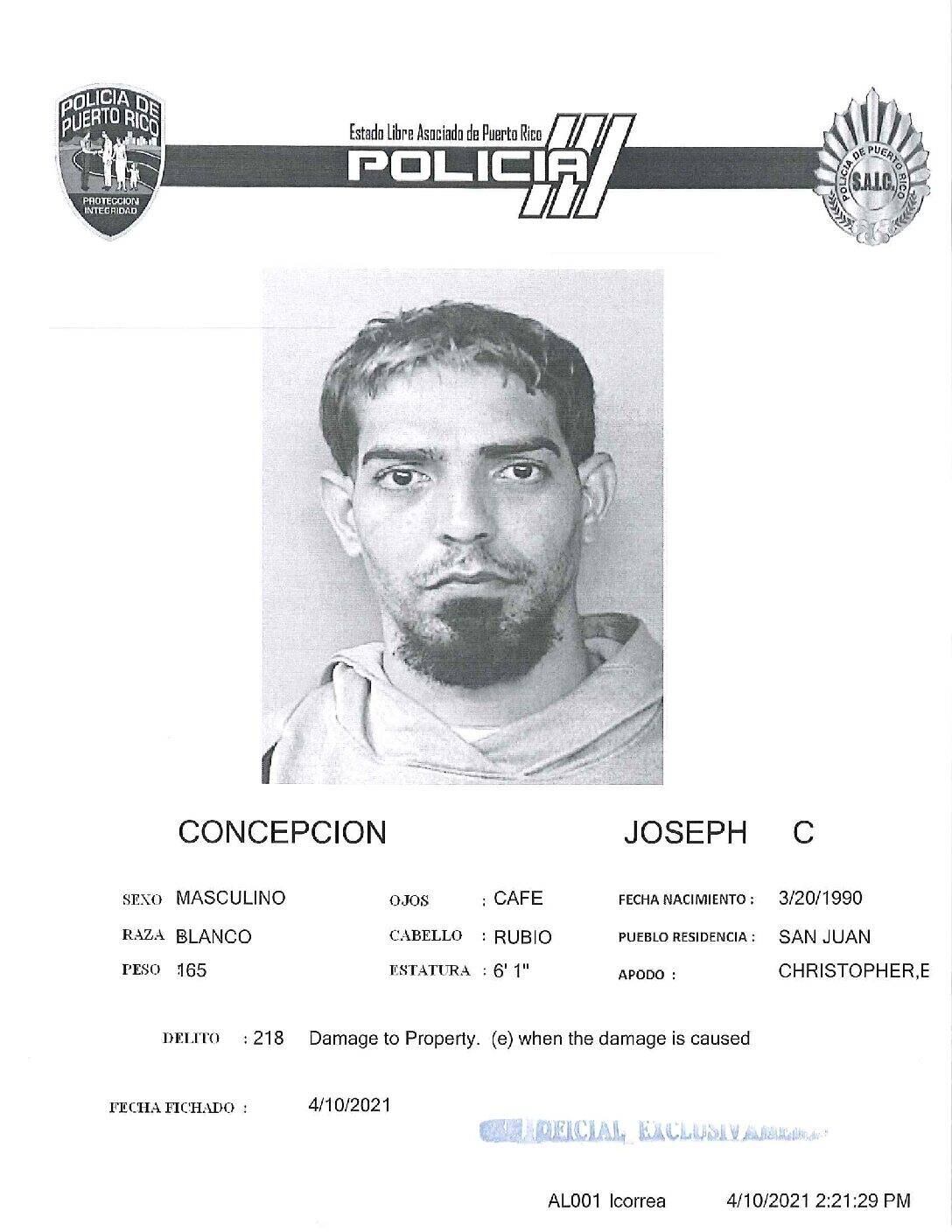 El jueves, 8 de abril, en el residencial Manuel A. Pérez de Hato Rey, Concepción fue intervenido por policías municipales de San Juan, en posesión de un vehículo Mitsubishi Mirage color negro.