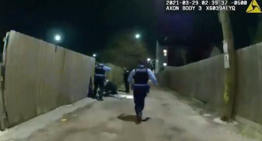 Un fotograma del video tomado por la cámara corporal del agente policial Eric Stillman muestra que Adam Toledo no tenía nada en las manos y que sus brazos estaban al menos parcialmente levantados cuando Stillman le disparó en el pecho alrededor de las 3 de la mañana del 29 de marzo.