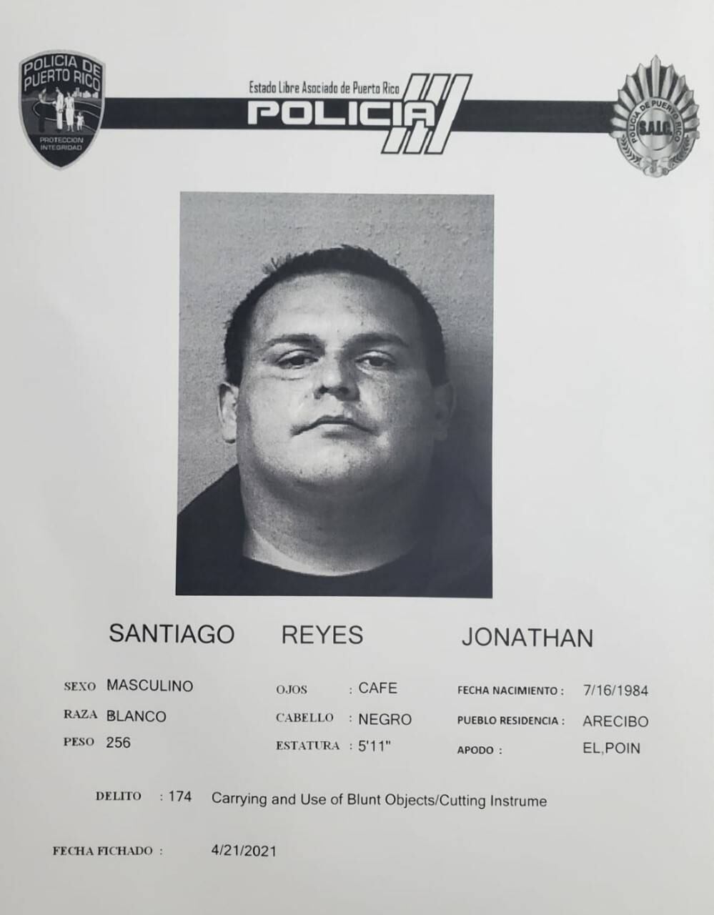 El agente Carlos Rodríguez Rivera, del Precinto 107 Arecibo, en unión al fiscal Alberto Cruz Cruz, de la fiscalía de Arecibo, radicó un cargo por Ley de armas contra Jonathan Santiago Reyes, alias Poin, de 36 años y residente del pueblo de Arecibo.