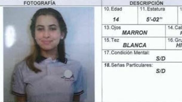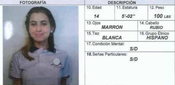 Nayeli Mojica Vega, de 14 años, fue reportada desaparecida por su madre, Belmarie Vega Ruiz, y fue descrita como 5 pies 2 pulgadas de estatura, 100 libras de peso, tez blanca, ojo marrón, y cabello rubio.