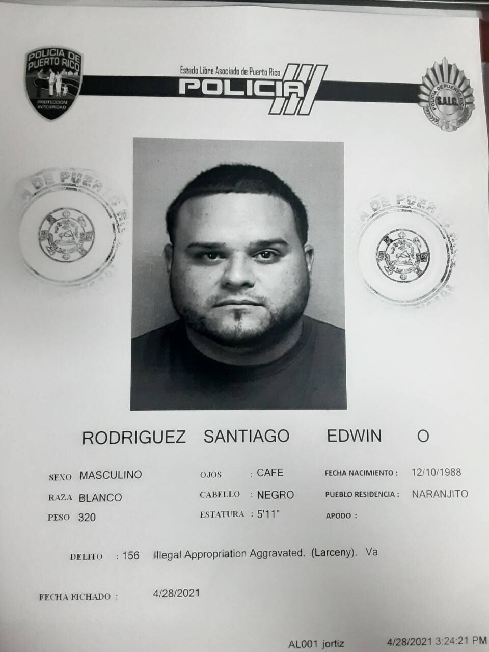 Por estos hechos, la División de Delitos contra la Propiedad de Bayamón consultó el caso con la fiscal Daphne Cordero Guilloty, quien ordenó radicarle los cargos. Tras ser llevado ante la juez Alicia Kuilan Medina, se le determinaron causa en los delitos, señalando una fianza global de $10,000.00, la cual prestó.