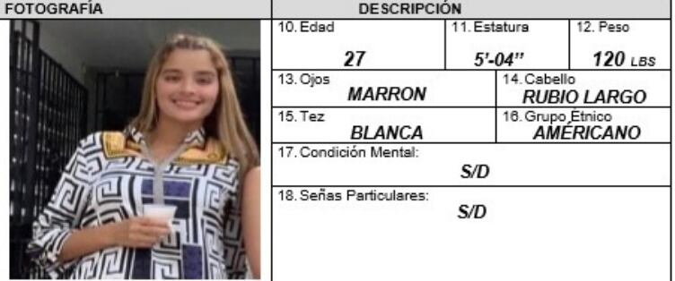 Keishla Marlen Rodríguez Ortiz, de 27 años, fue reportada desaparecida por su madre, Keila Ortiz Rivera y fue descrita como de 5’4” de estatura, 120 libras de peso, tez blanca, ojos marrones, y cabello rubio largo.