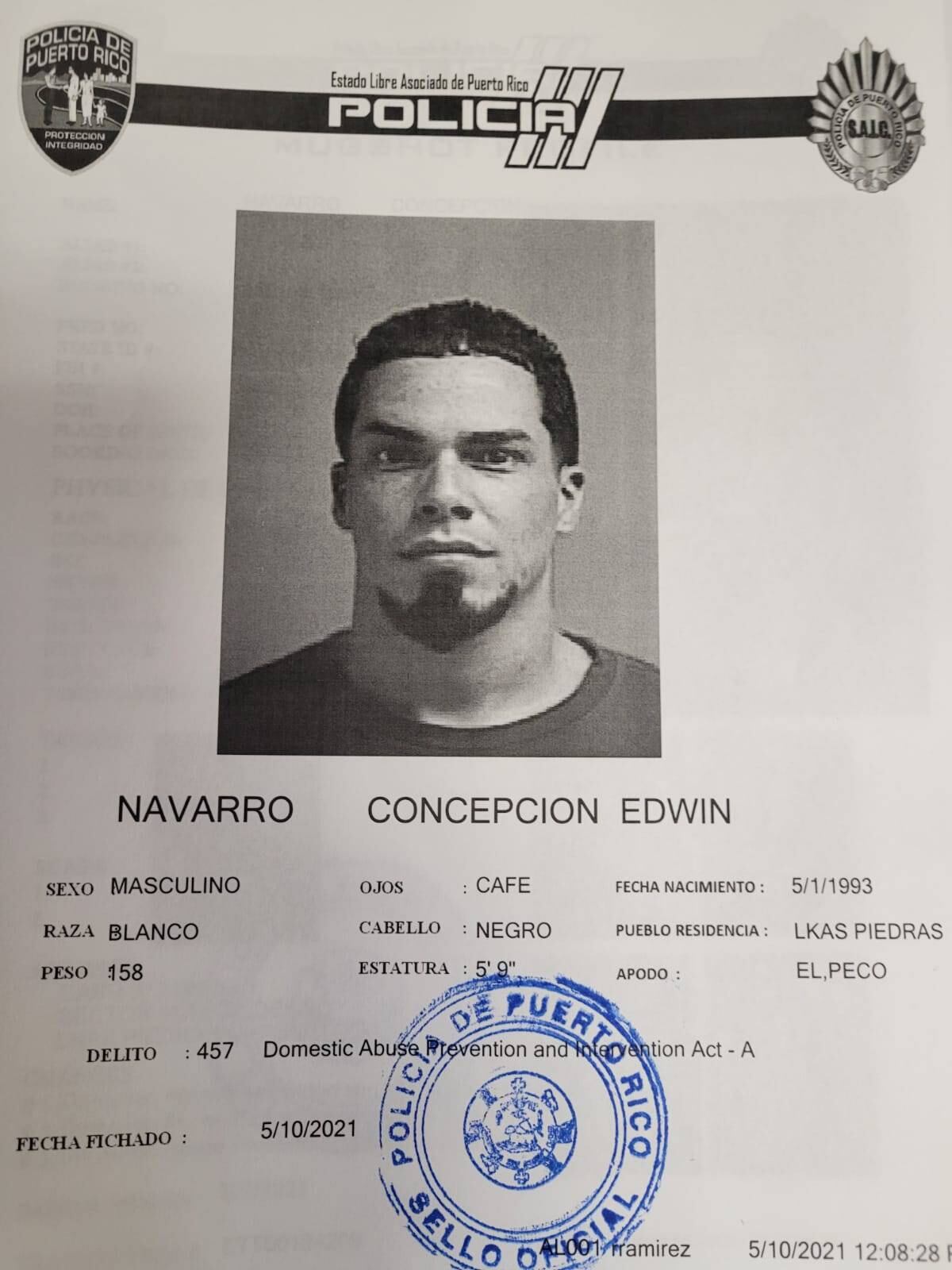 El agente Antonio Maldonado, adscrito a la División de Arrestos y Allanamientos del Cuerpo de Investigaciones Criminales del Área de Caguas, diligenció una orden de arresto en contra Edwin Navarro Concepción de 28 años, por violación al artículo 3.3 (maltrato mediante amenaza) y 2 cargos por el artículo 3.1 (Maltrato)de la Ley 54.