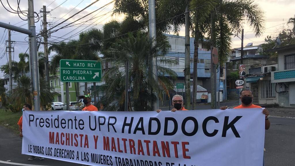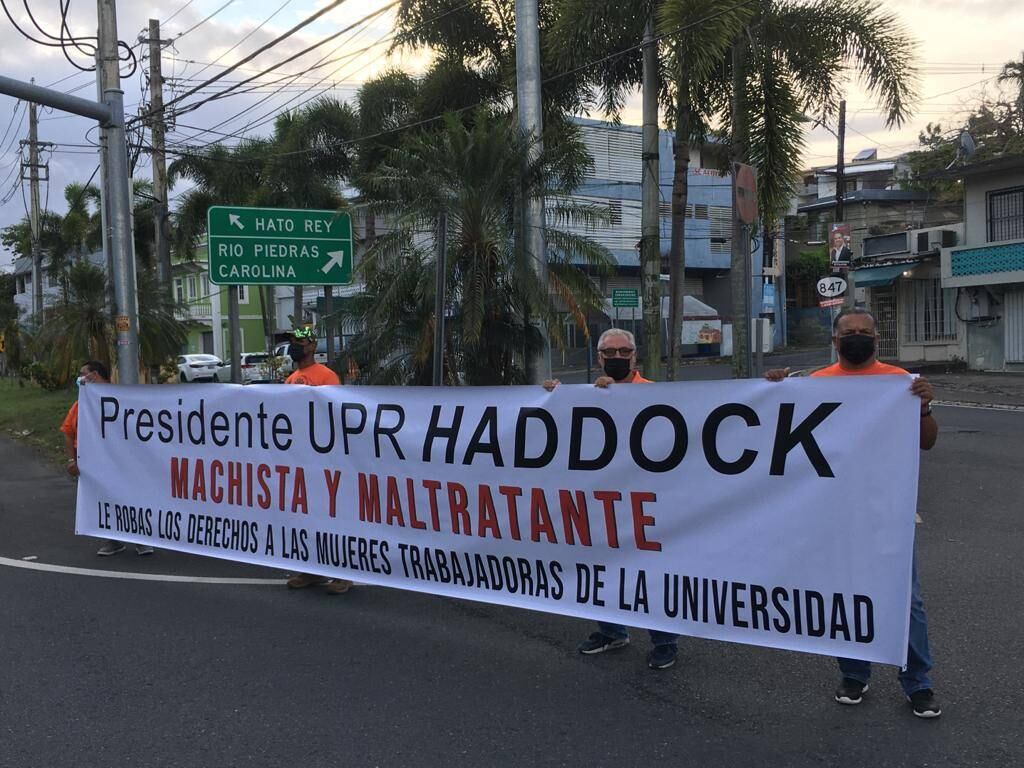 En los tres lugares que el sindicato se manifestó, los participantes de la protesta mostraron una pancarta con el mensaje, “Presidente UPR, Haddock, machista y maltratante, le robas los derechos a las mujeres trabajadoras de la Universidad”.