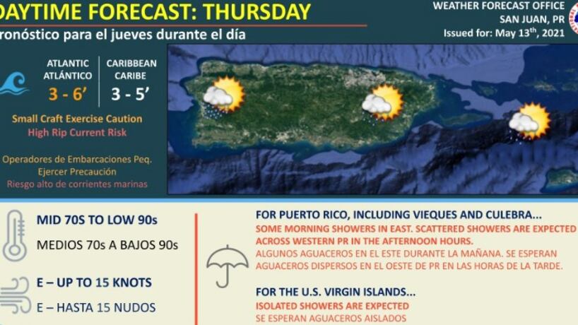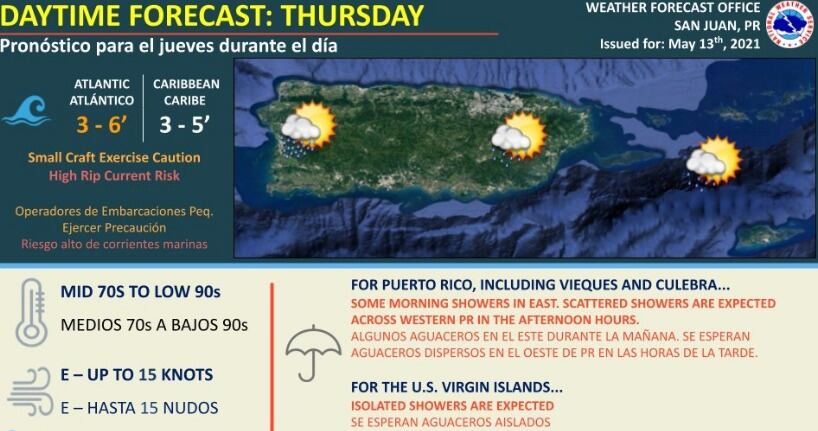 Para este jueves en la mañana se esperan algunos aguaceros en el este de Puerto Rico, mientras que en la tarde la lluvia será en el oeste de la isla, informó la oficina en San Juan del Servicio Nacional de Meteorología (SNM).