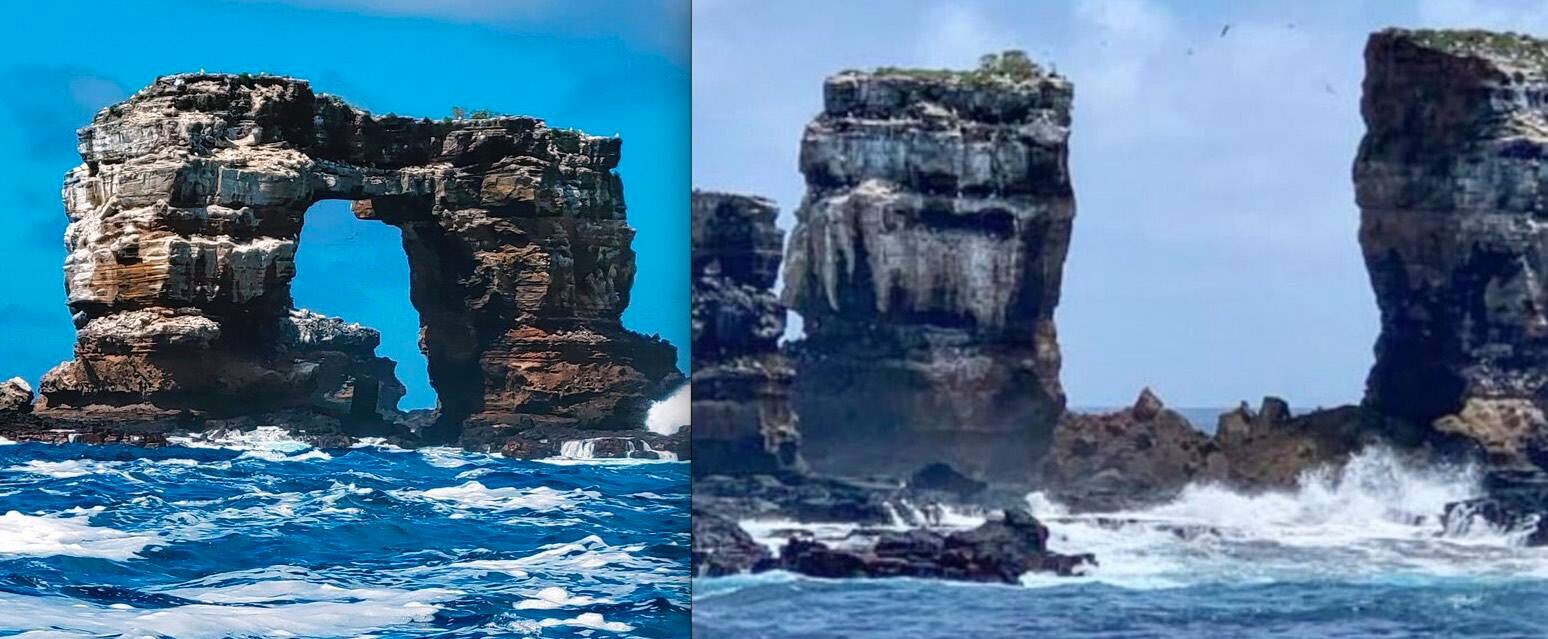 El Parque Nacional Galápagos recibió las primeras imágenes en las que se observan dos pilares de roca en el mar pero sin el dintel superior. Poco después el Ministerio de Ambiente confirmó el derrumbe que fue descubierto por un barco turístico que navegaba por esa zona.