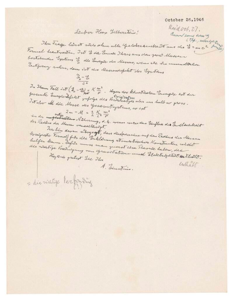 La misiva de una página, escrita en alemán y dirigida al físico polaco-estadounidense Ludwik Silberstein, está fechada el 26 de octubre de 1946.