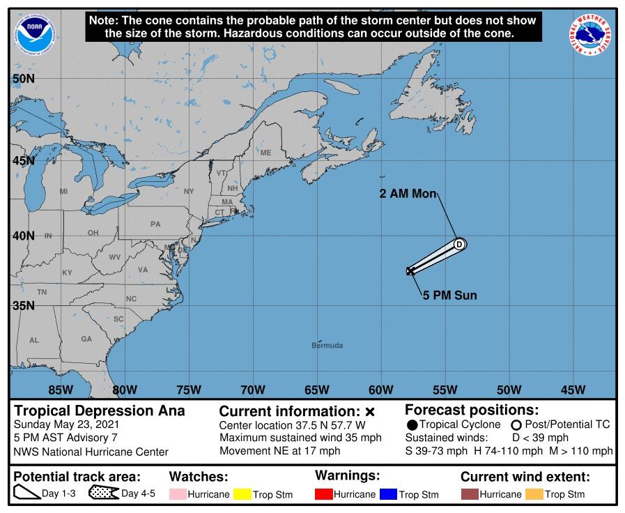 Ana era una tormenta subtropical al formarse el sábado por la mañana, y al día siguiente se volvió tormenta tropical. Horas más tarde se degradó a depresión. El centro de huracanes indicó que perderá más fuerza en las próximas 24 horas y se disipará el lunes.