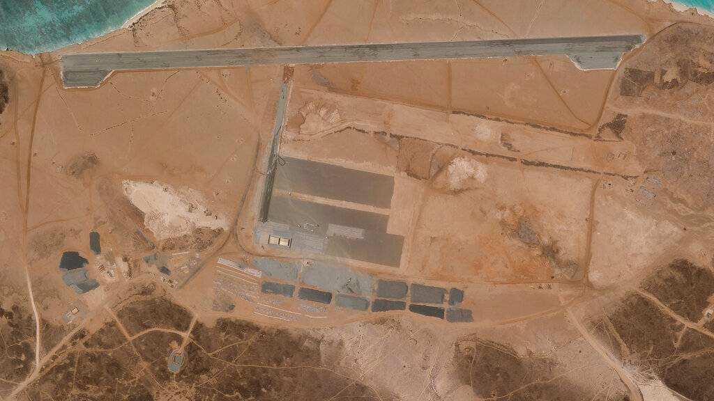 Imágenes satelitales de Planet Labs Inc. obtenidas por la AP mostraron las obras de construcción de una pista de 1,85 kilómetros (6.070 pies) el 11 de abril. Hacia el 18 de mayo, las obras parecían terminadas, con tres hangares.
