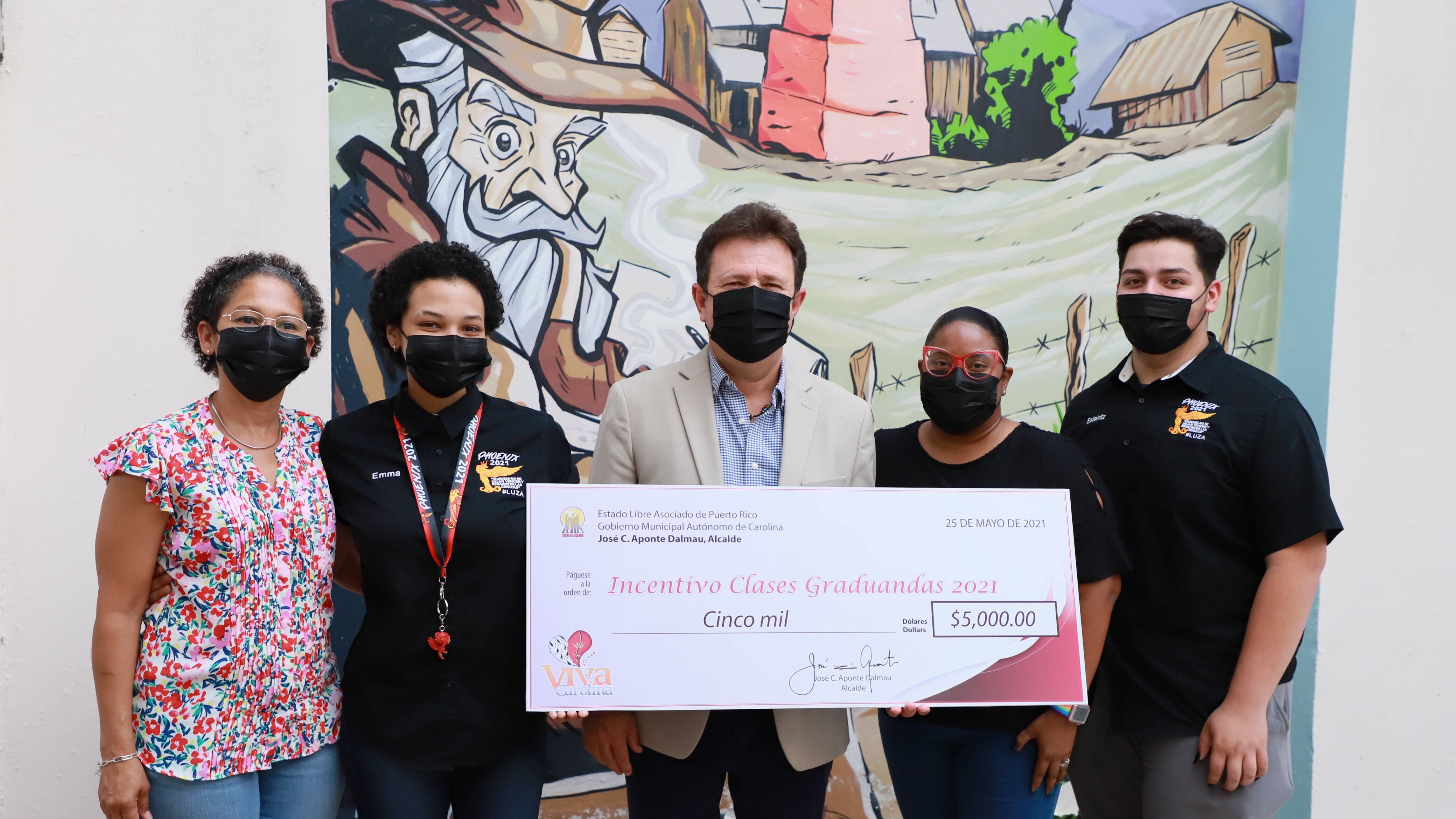 En una sencilla ceremonia celebrada en la Plaza Rey Fernando, los jóvenes de las diferentes directivas de las clases graduandas 2021, los padres coordinadores junto a los directores escolares recibieron de manos del alcalde de Carolina, José Carlos Aponte un cheque con la ayuda económica con el fin de colaborar con los gastos que conllevan los actos de otorgación de grados.