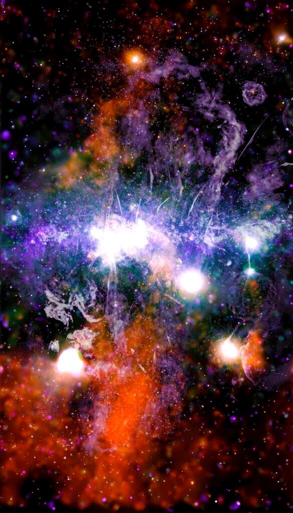 “Lo que vemos en la panorámica es un ecosistema turbulento o energético en el centro de nuestra galaxia”, afirmó Wang en un correo electrónico. “Hay numerosos remanentes de supernovas, hoyos negros y estrellas de neutrones ahí. Cada punto o elemento de rayos X representa una fuente energética, la mayoría de las cuales se encuentran en el centro”.