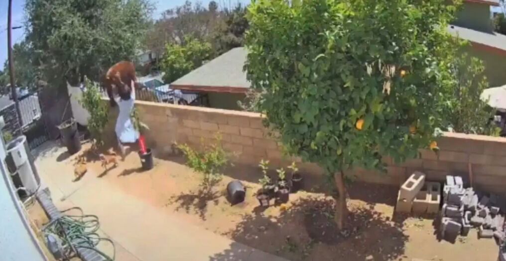 En el video, que dura un minuto de duración, se aprecia cómo un oso intenta saltar la barda del patio de una casa, donde se encuentran los perros de la familia.