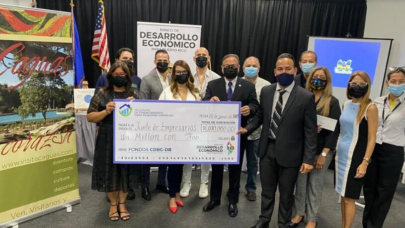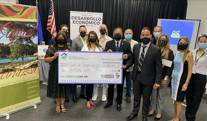 El presidente del Banco de Desarrollo Económico para Puerto Rico (BDE), Luis Alemañy González, entregó hoy, junto al alcalde de Caguas, William E. Miranda Torres, un millón de dólares en subvenciones a pequeños y medianos comerciantes.