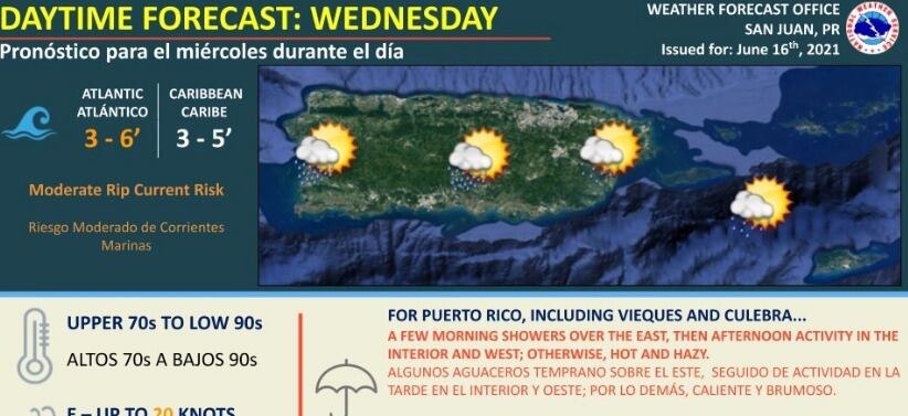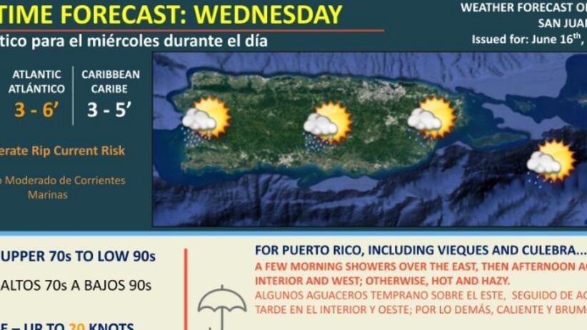 Para este miércoles se espera tiempo caliente y brumoso, con algunos aguaceros sobre el este de Puerto Rico en la mañana, mientras que durante la tarde se anticipa lluvia en el interior y oeste de la isla, informó la oficina en San Juan del Servicio Nacional de Meteorología (SNM).