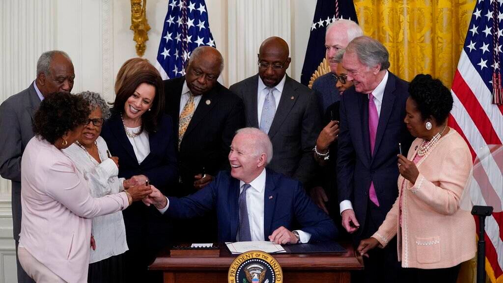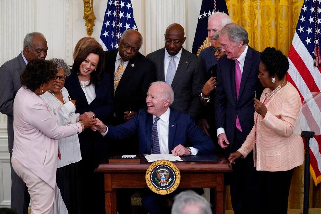 Biden promulgó un proyecto de ley para convertir el Juneteenth, o el 19 de junio, en el duodécimo feriado federal. La Cámara votó 415-14 el miércoles para enviar el proyecto de ley a Biden, mientras que el Senado aprobó el proyecto de ley por unanimidad el día anterior.