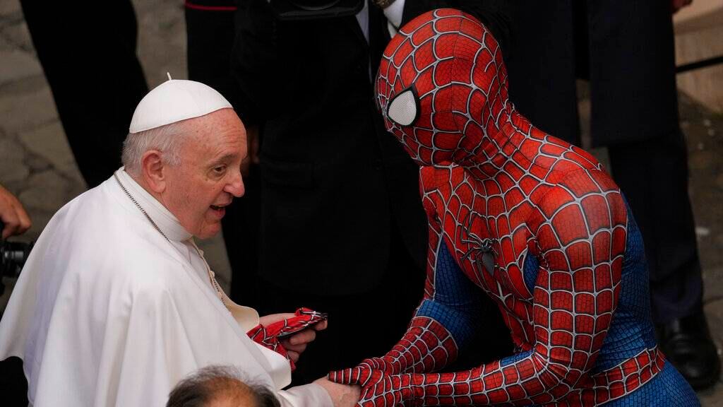 Aunque el papa Francisco generalmente es la estrella en las reuniones en el Vaticano, esta vez el Hombre Araña, o un hombre que se disfraza del personaje, acaparó la atención de los que asistieron a la audiencia general de los miércoles.