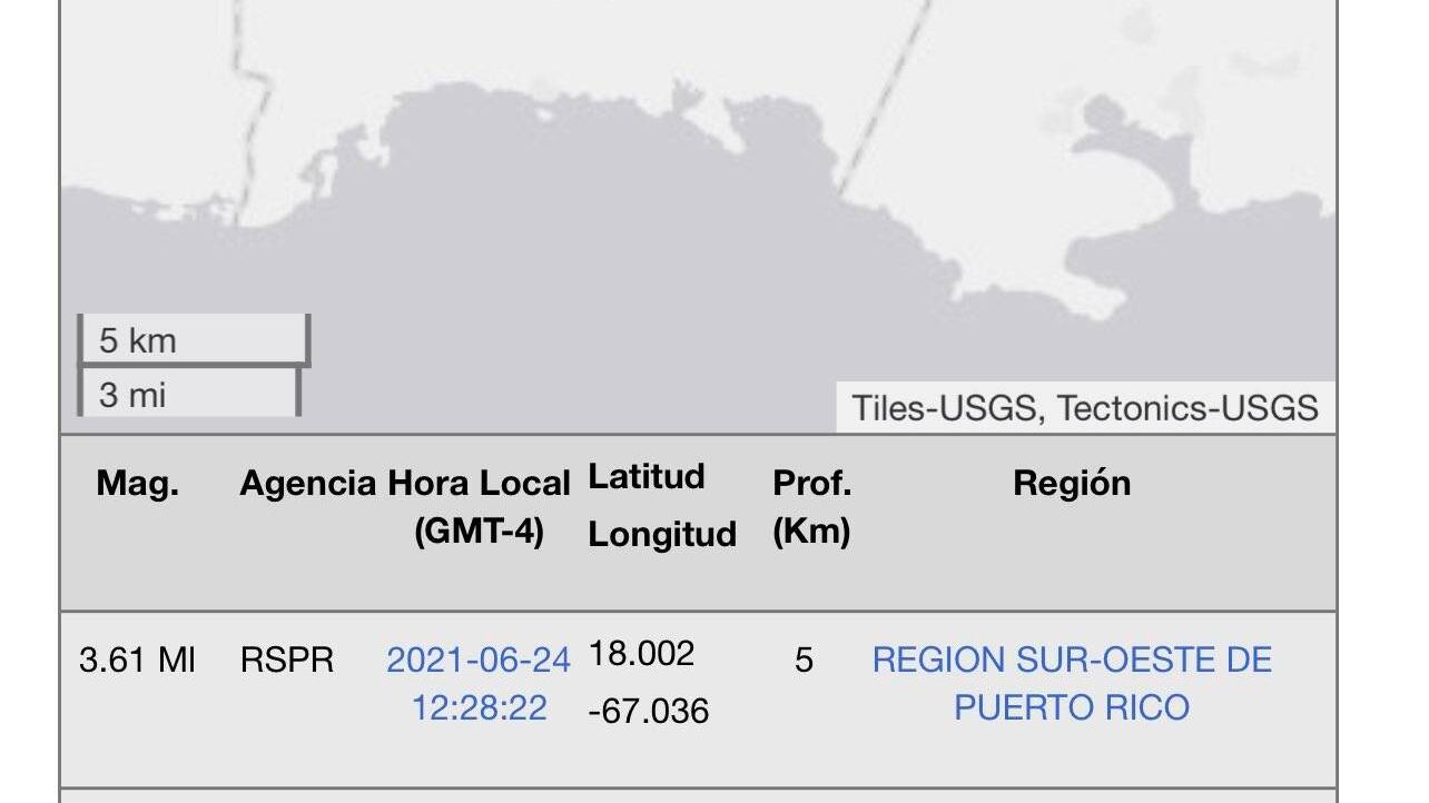 La Red Sísmica de Puerto Rico informó sobre un movimiento sísmico registrado hoy en Lajas con una magnitud de 3.66 grados en la escala Ritcher.