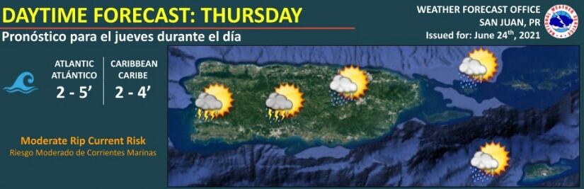 Para este jueves en la mañana se esperan aguaceros en el este de Puerto Rico e Islas Vírgenes, mientras que para la tarde se anticipan lluvias y tronadas aisladas sobre el interior y oeste de la isla, informó la oficina en San Juan del Servicio Nacional de Meteorología (SNM).