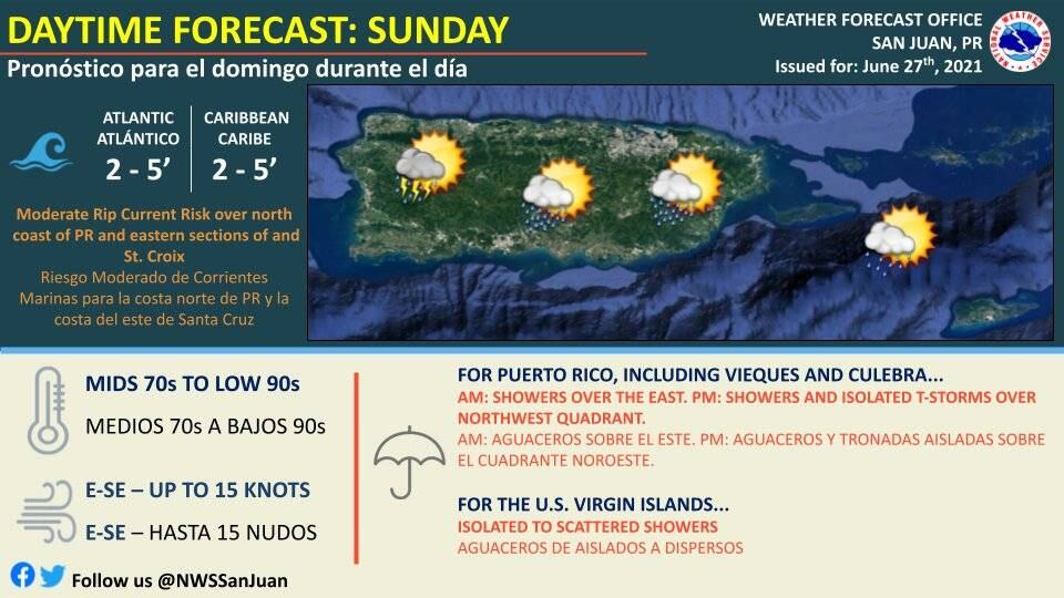 Para este domingo en la mañana se esperan aguaceros en el este de Puerto Rico, mientras que para la tarde se anticipan lluvias y tronadas aisladas sobre el noroeste de la Isla, informó la oficina en San Juan del Servicio Nacional de Meteorología (SNM).