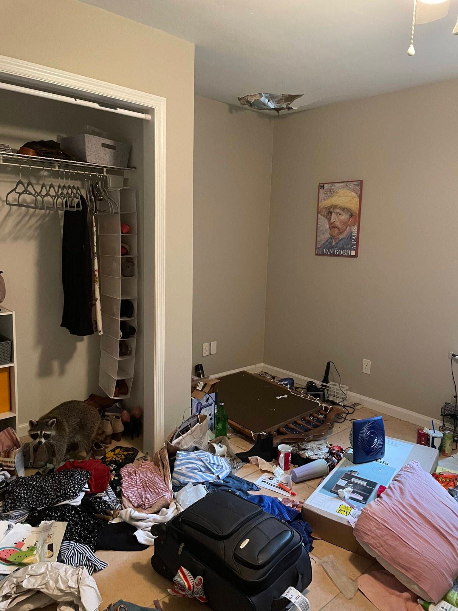 Según contó la estudiante universitaria a través de Twitter, “un mapache cayó por el techo en mi habitación”.