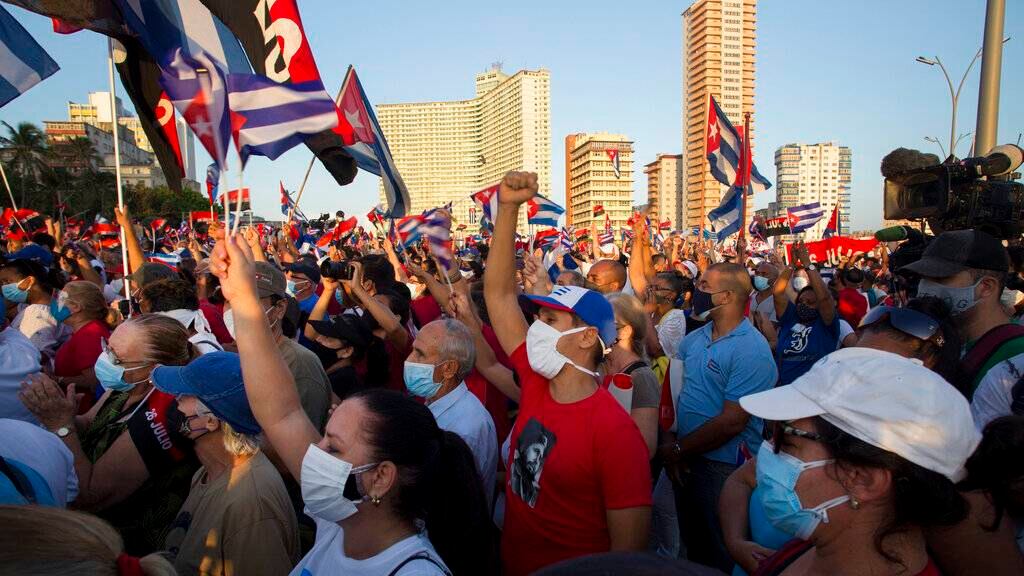 El presidente Miguel Díaz-Canel y dirigentes cubanos encabezaron el sábado manifestaciones de decenas de miles personas en apoyo a la revolución en muchas localidades del país, como una forma de mostrar adhesión de la población al gobierno, sacudido esta semana por las protestas más importantes en seis décadas.