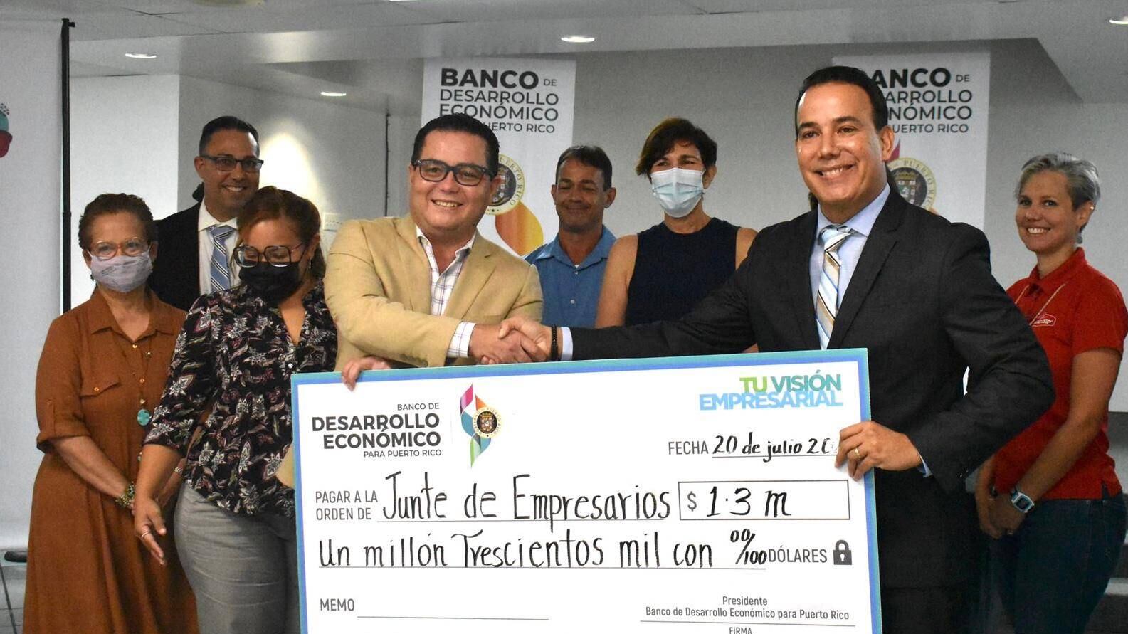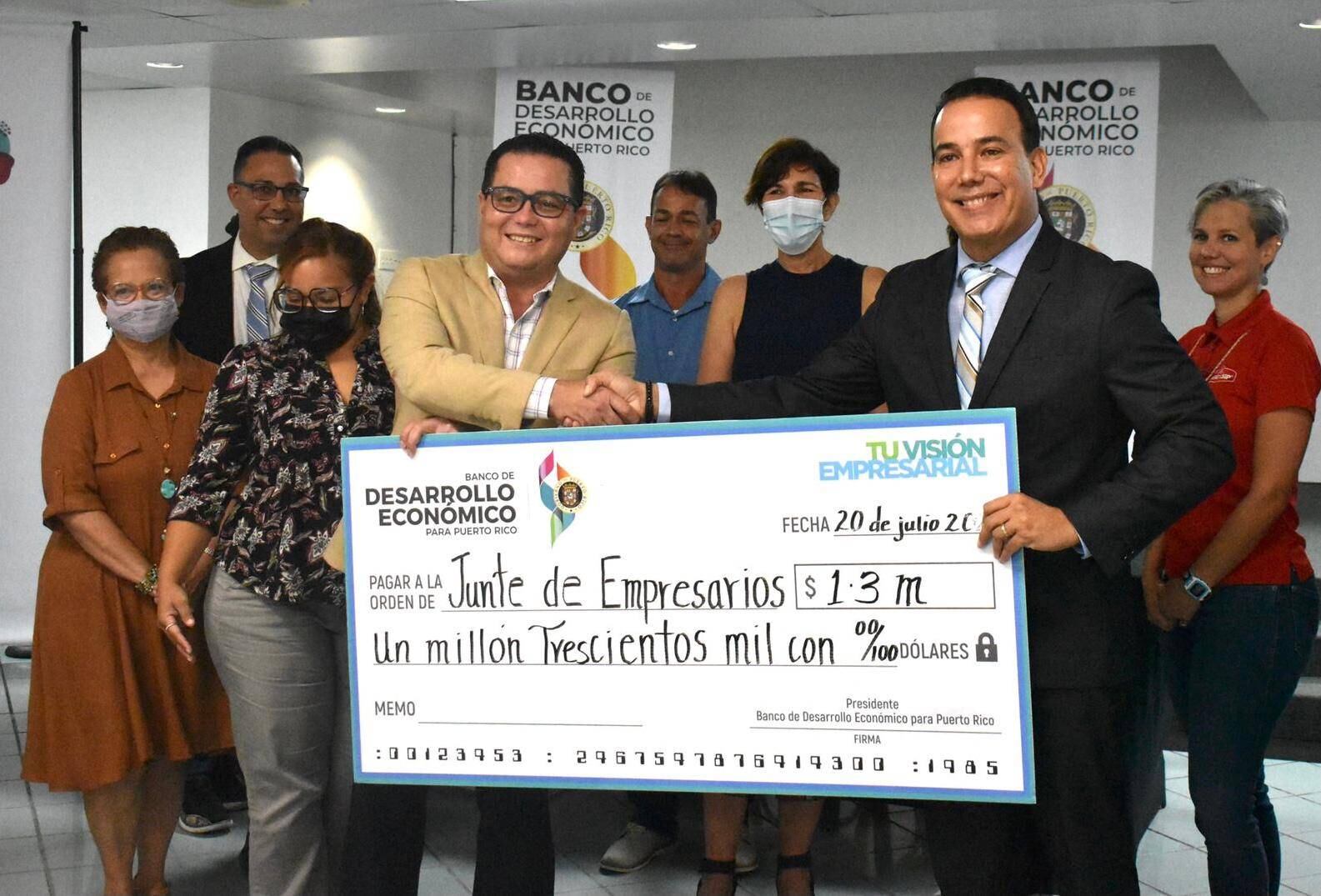 El presidente del Banco de Desarrollo Económico, Luis Alemañy González y el alcalde de Guaynabo, Ángel Pérez, anunciaron hoy, martes, la firma de los cierres de subvenciones del programa CDBG-DR junto a comerciantes de este municipio para un total de $1.3 millones.