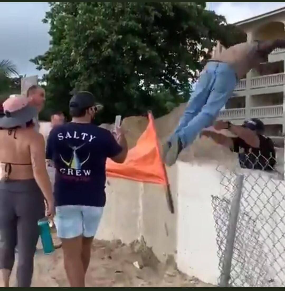 Según se ve en el video, el hombre estaba parado en un muro de cemento que se alza sobre la playa. Allí intercambió pocas palabras con el guardia quien procedió a empujarlo con fuerza, haciéndolo caer sobre la estructura.