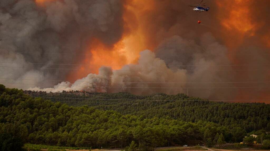 Las altas temperaturas y los fuertes vientos avivaron las llamas en la zona rural ubicada a 100 kilómetros (62 millas) al oeste de Barcelona. El incendio estalló el sábado por la noche.