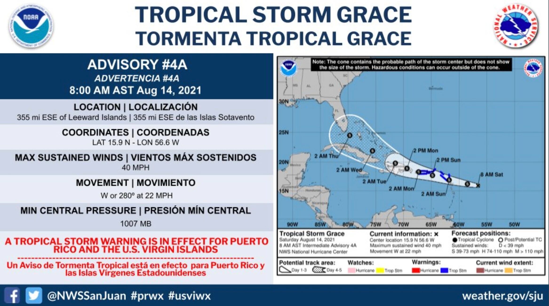 La tormenta Grace continúa moviéndose rápidamente hacia las Islas Sotavento, informó el Centro Nacional de Huracanes en su boletín de las 8:00 a.m.