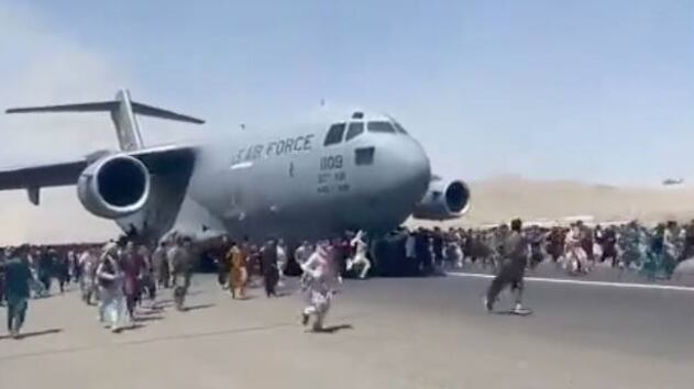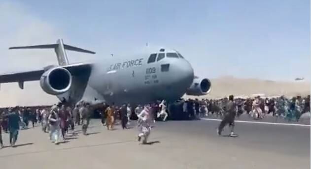 Videos que circulan en redes sociales muestran a cientos de personas corriendo por la pista mientras las tropas estadounidenses disparaban tiros de advertencia al aire. En un video se veía a una multitud empujando y subiendo una escalera, tratando de abordar un avión, con algunas personas colgando de las barandillas.