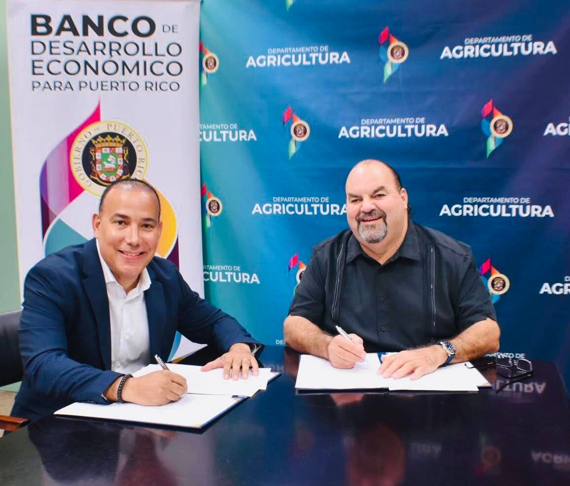 El presidente del Banco de Desarrollo Económico para Puerto Rico (BDE), Luis Alemañy González, y el secretario del Departamento de Agricultura (DA), Ramón González Beiró, firmaron un acuerdo interagencial para fomentar y apoyar a la industria agrícola de Puerto Rico.