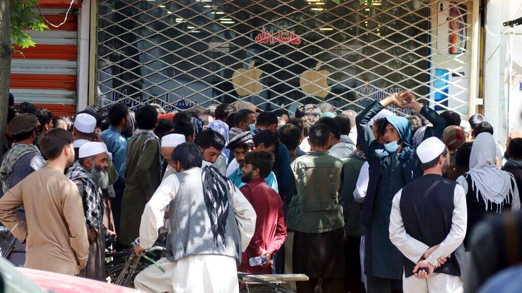 En Kabul, cientos de afganos protestaron el sábado frente a una sucursal bancaria y otros formaron largas filas en los cajeros automáticos.