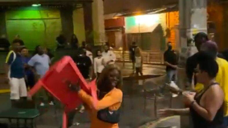 En el vídeo se observa cómo una mujer lanza bebidas, sillas y otros objetos, donde incluso fue agredido un empleado del restaurante en el rostro.