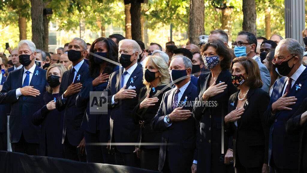 Los presidentes Joe Biden, Barack Obama y Bill Clinton se reunieron en el lugar donde cayeron las torres del World Trade Center hace dos décadas. Cada uno portaba cintas azules y se cubrió el corazón con las manos mientras una procesión avanzaba con una bandera estadounidense a través del monumento ante cientos de personas, algunas con fotos de los seres queridos que perdieron en los ataques.