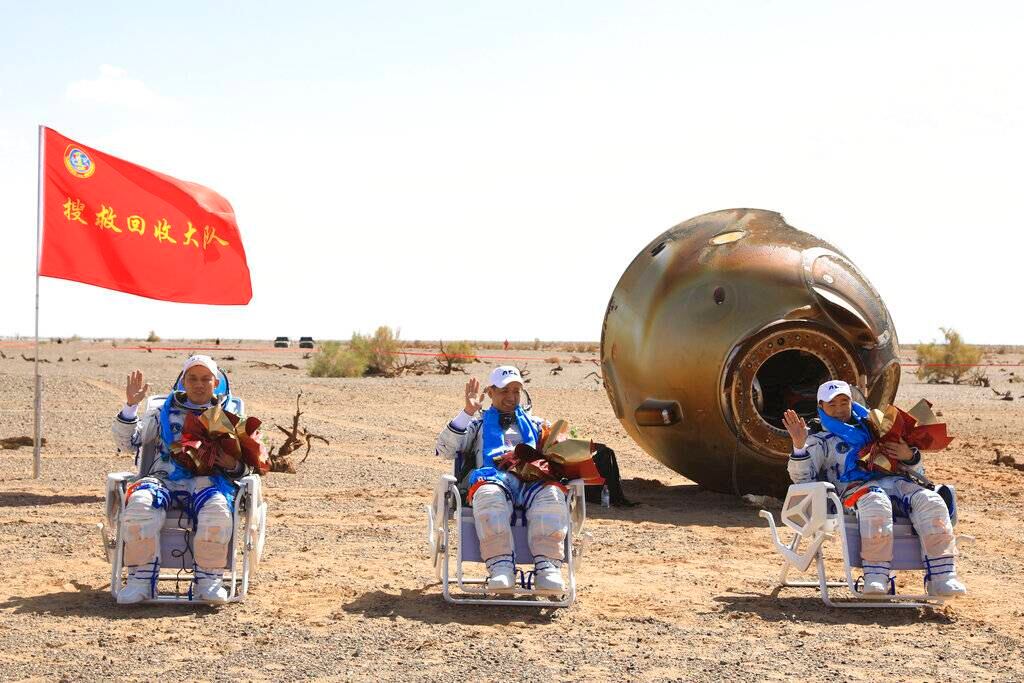 Los tres astronautas salieron al exterior unos 30 minutos más tarde y se sentaron en sillas reclinables delante de la sonda para aclimatarse a la gravedad terrestre luego de tres meses en un entorno sin gravedad. Está previsto que los tres vuelen a Beijing el viernes.