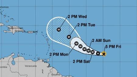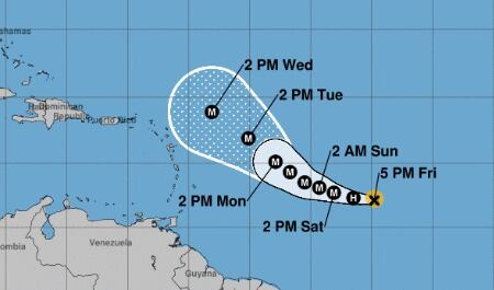 El Centro Nacional de Huracanes (CNH), en Miami, Florida informó en su boletín de las 5:00 de la tarde, que se localizó el centro del huracán Sam cerca de latitud 12,1 grados Norte, longitud 44,8 grados Oeste.