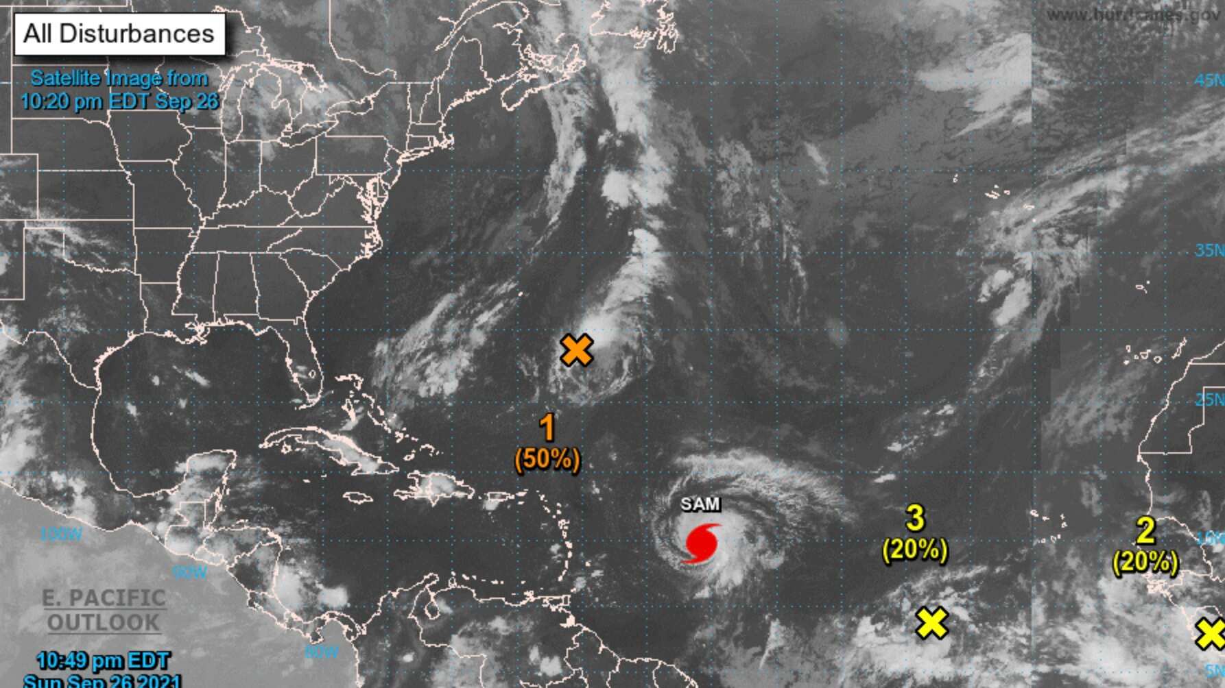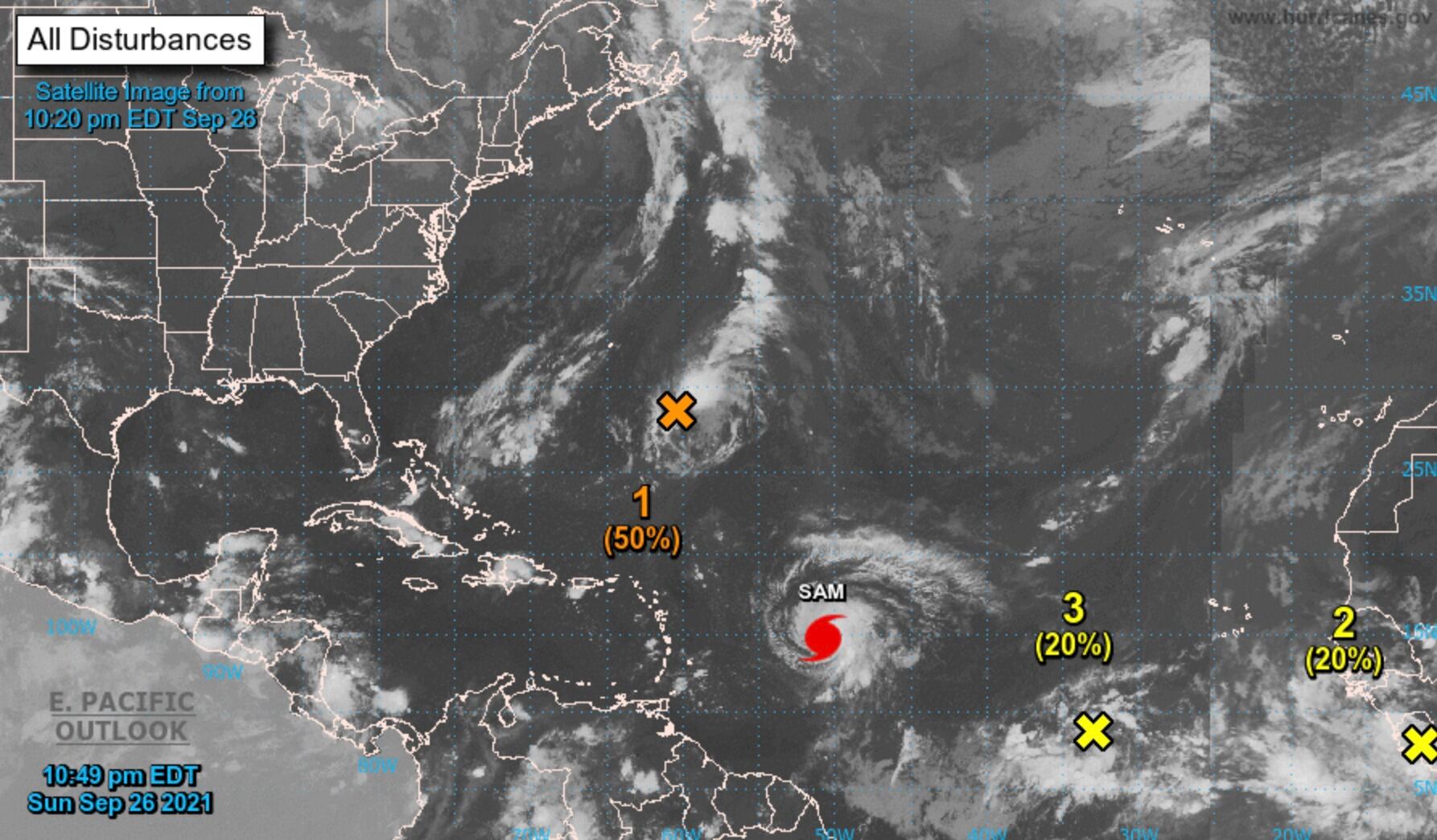 El Centro Nacional de Huracanes (CNH) informó en el boletín de las 11:00 p.m. que el huracán Sam se mantiene con vientos máximos sostenidos de 145 millas por hora (mph) mientras se desplaza al noroeste a siete mph.