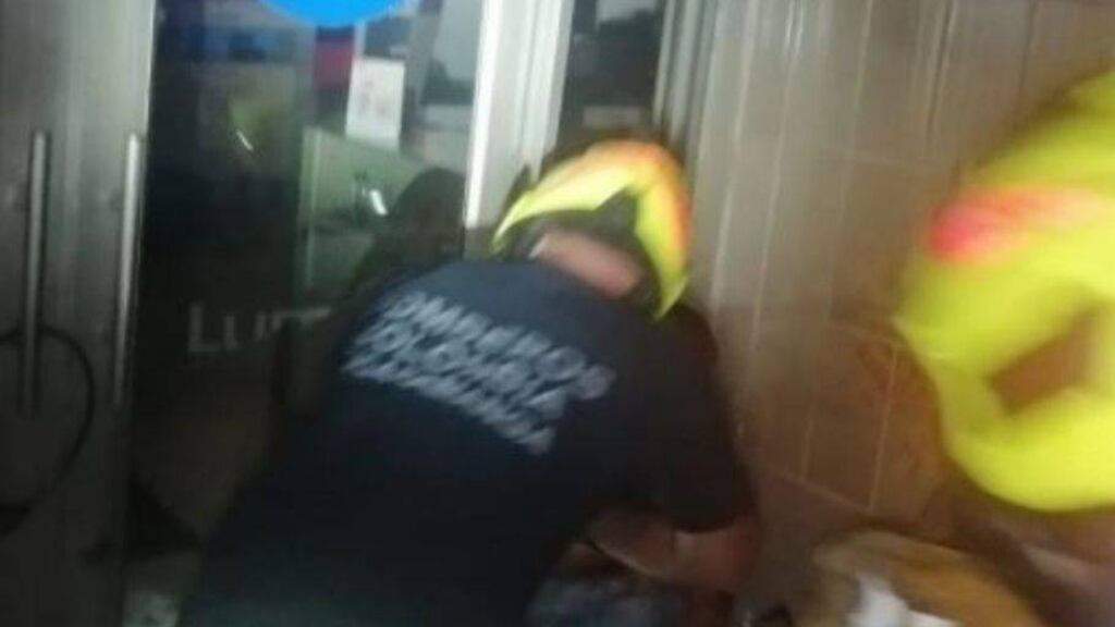 Tras dos horas de estar atrapado en el lugar, miembros del cuerpo de Bomberos lograron sacarlo. Tuvieron que dañar el marco de la puerta para lograr liberarlo.