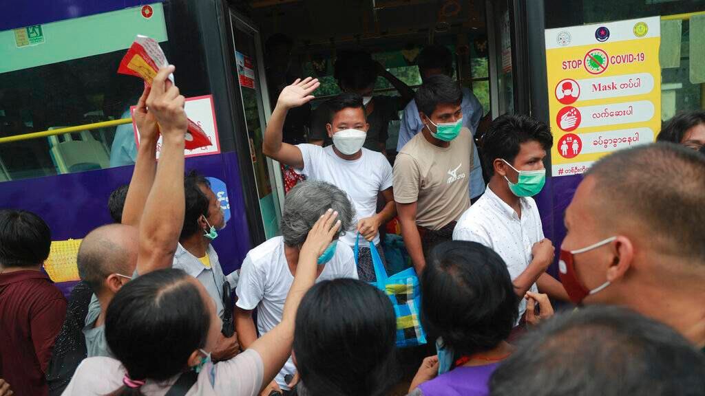 En la prisión de Insein, en Yangon, que durante décadas ha sido el principal lugar de detención de los presos políticos, salieron de las puertas una serie de autobuses con detenidos liberados, que se abrieron paso entre una multitud jubilosa.