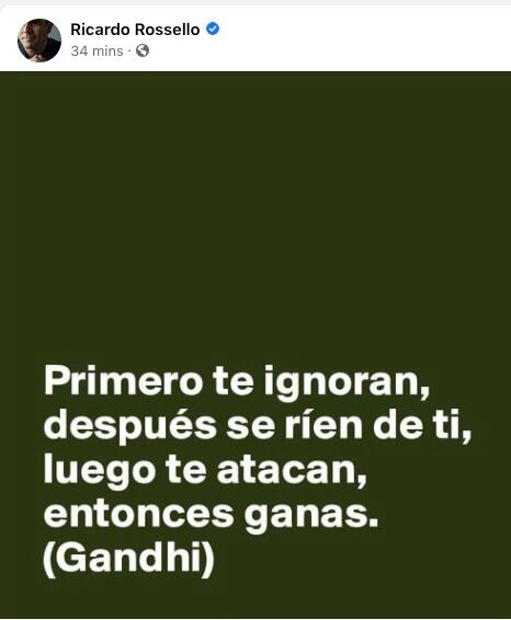 “Primero te ignoran, después se ríen de ti, luego te atacan, entonces ganas”, lee la imagen publicada por Rosselló y otras figuras.