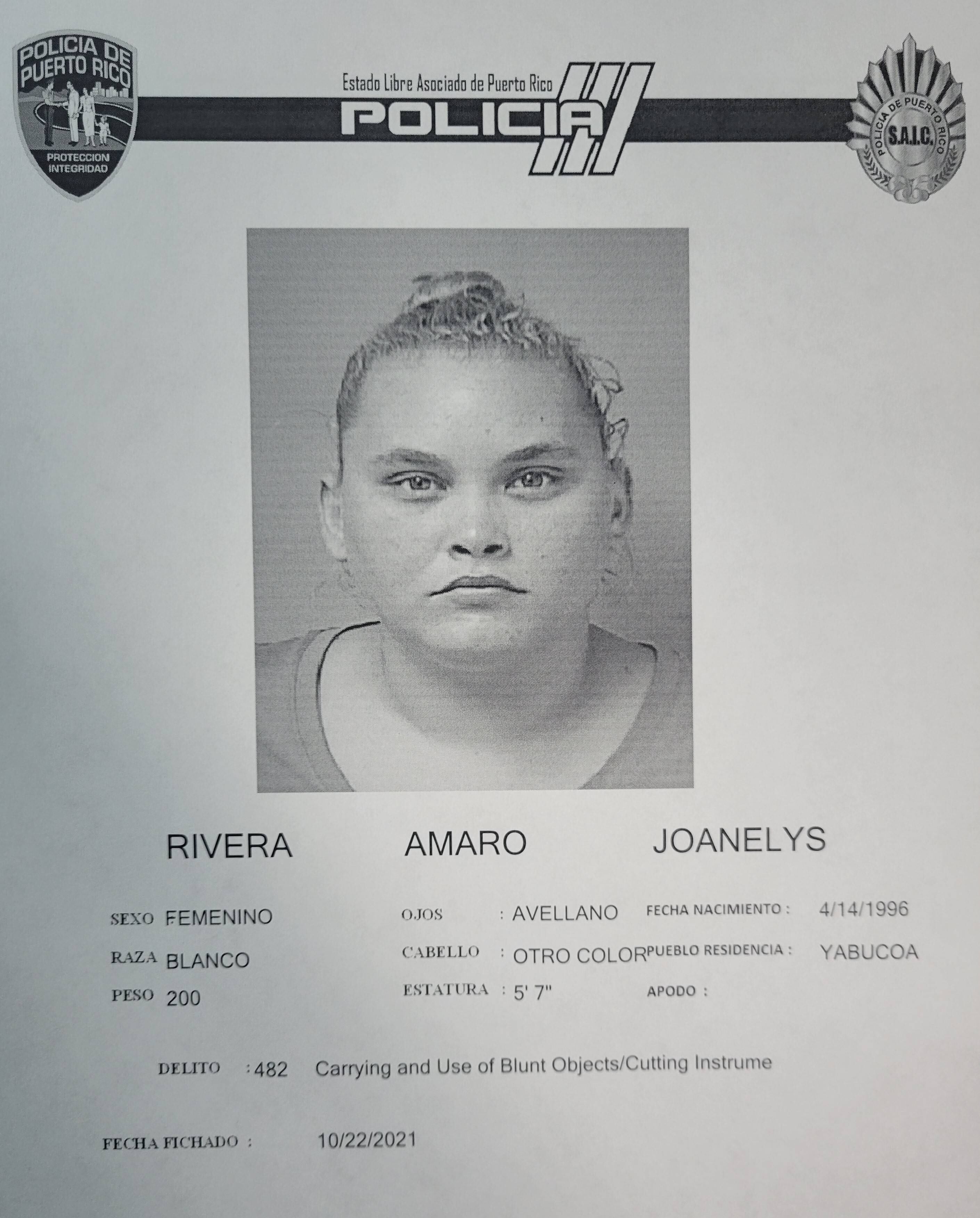 Las autoridades informaron hoy, sábado, la radicación de cargos por Agresión, Daños y Ley de Armas contra Joanelys Rivera Amaro.